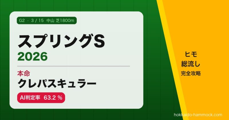 2026年3月15日(日)、中山競馬場でG2「スプリングステークス」が開催されます。皐月賞トライアルとして注目を集めるこのレース、AI分析の結果を公開します。結論から言えば「1頭の絶対王者 + ヒモ総流し」という、シンプルかつ強烈な構造のレースです。 ... 雑記