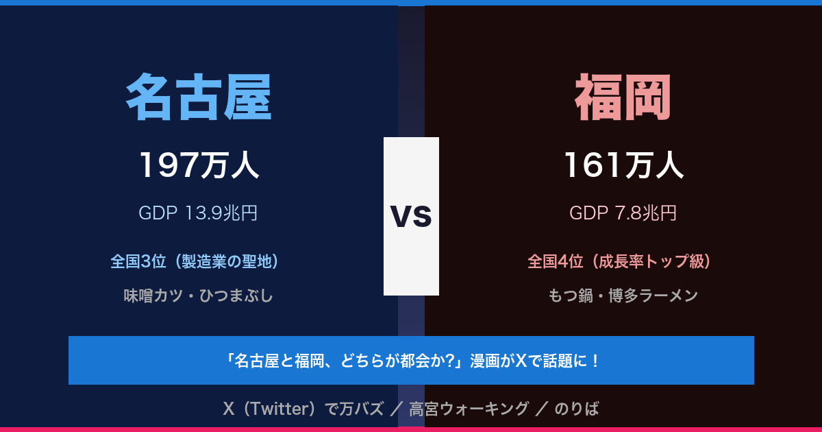 「名古屋と福岡、どっちが都会か問題」——あなたはどちら派ですか?ぜひXで #名古屋vs福岡 を検索して、白熱する議論に参加してみてください。