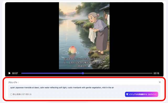 プロンプト画面が開くので文章を修正するかそのまま「ビジュアルを再描画する」を押すと再度動画を生成し直してくれます。画像は英語になっていますが日本語でも大丈夫です。(20コイン必要)